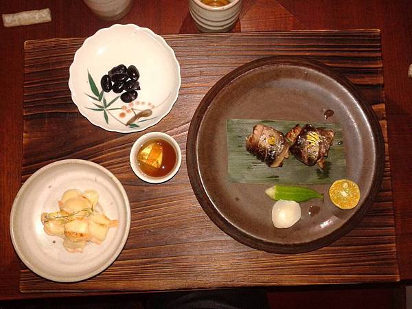 右邊是用魚肉再加捲不知什麼東西,然後有片百合,也有個「小小的」秋葵,左邊上面是黑豆,下面是火烤過的茭白荀,中間是蘋果醋!