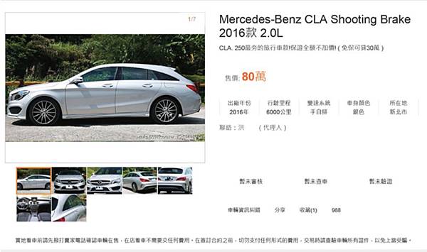 我看過一篇文章,有提到2014年BENZ CLA250價格超低,我也懷疑那些低價銷售是詐騙,而上圖就是嫌犯在網路刊登中古名車的販售資訊。(胡欣男翻攝)